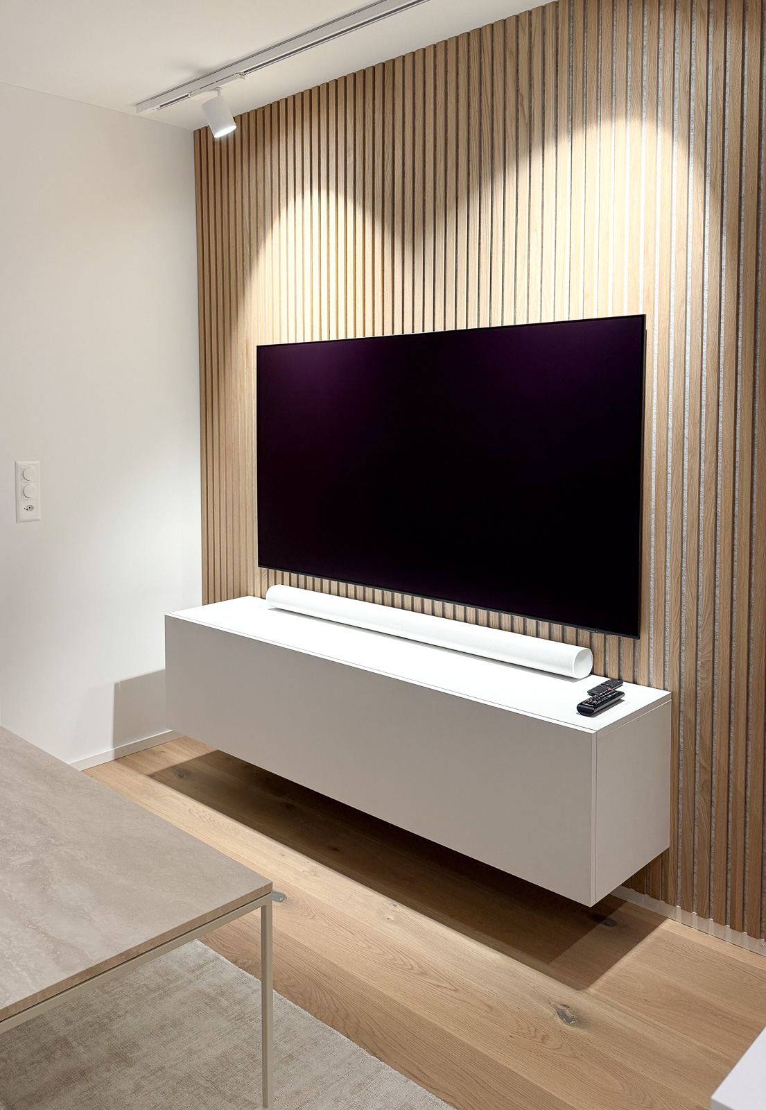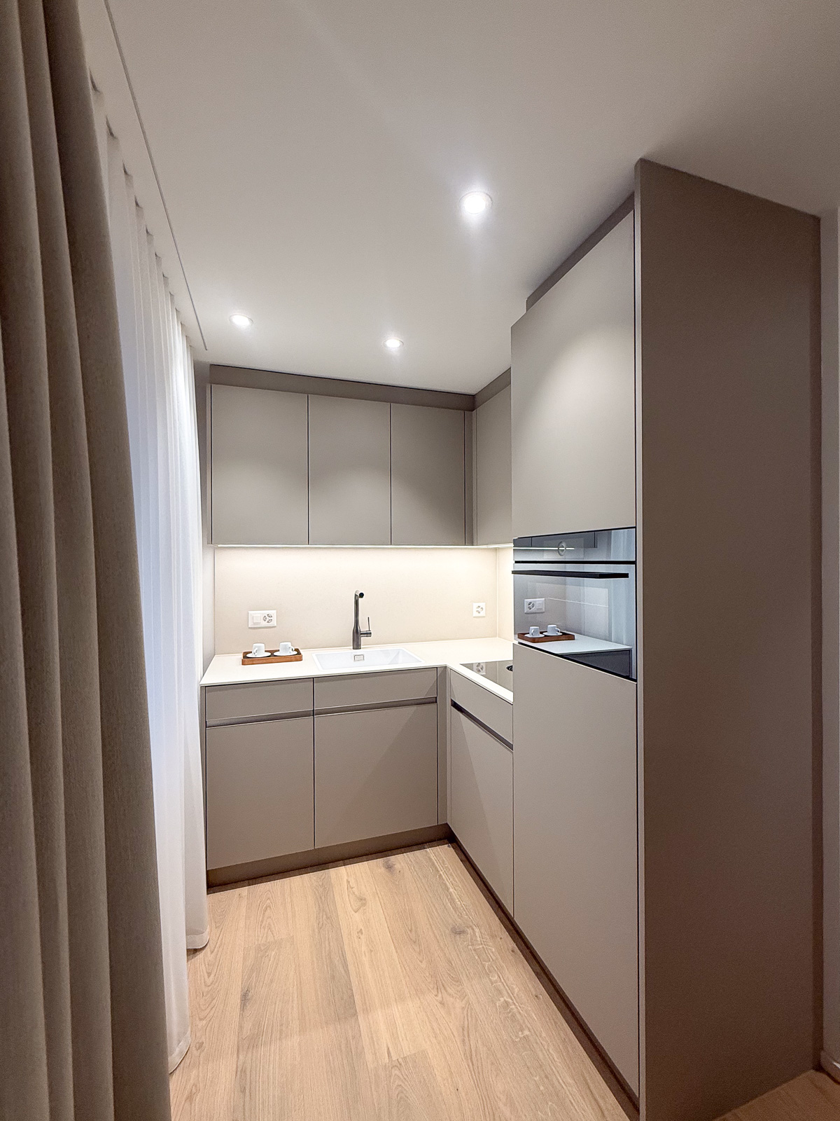 Für eine warme, wohnliche Atmosphäre wurde der alte Teppichboden durch einen hochwertigen Holzboden ersetzt. Die Küche, sowie alle Einbaumöbel, wurden nach unseren Entwürfen von einem lokalen Schreiner individuell angefertigt und eingebaut – maßgeschneidert, funktional und hochwertig.