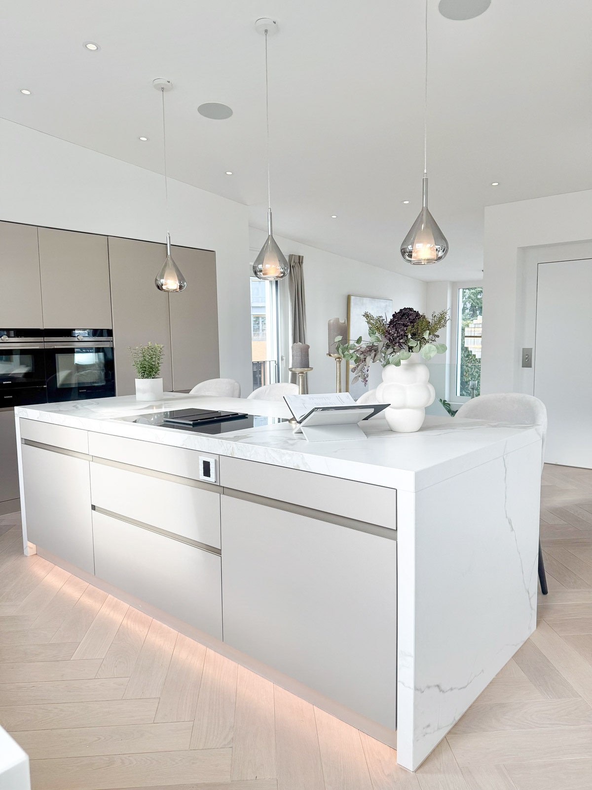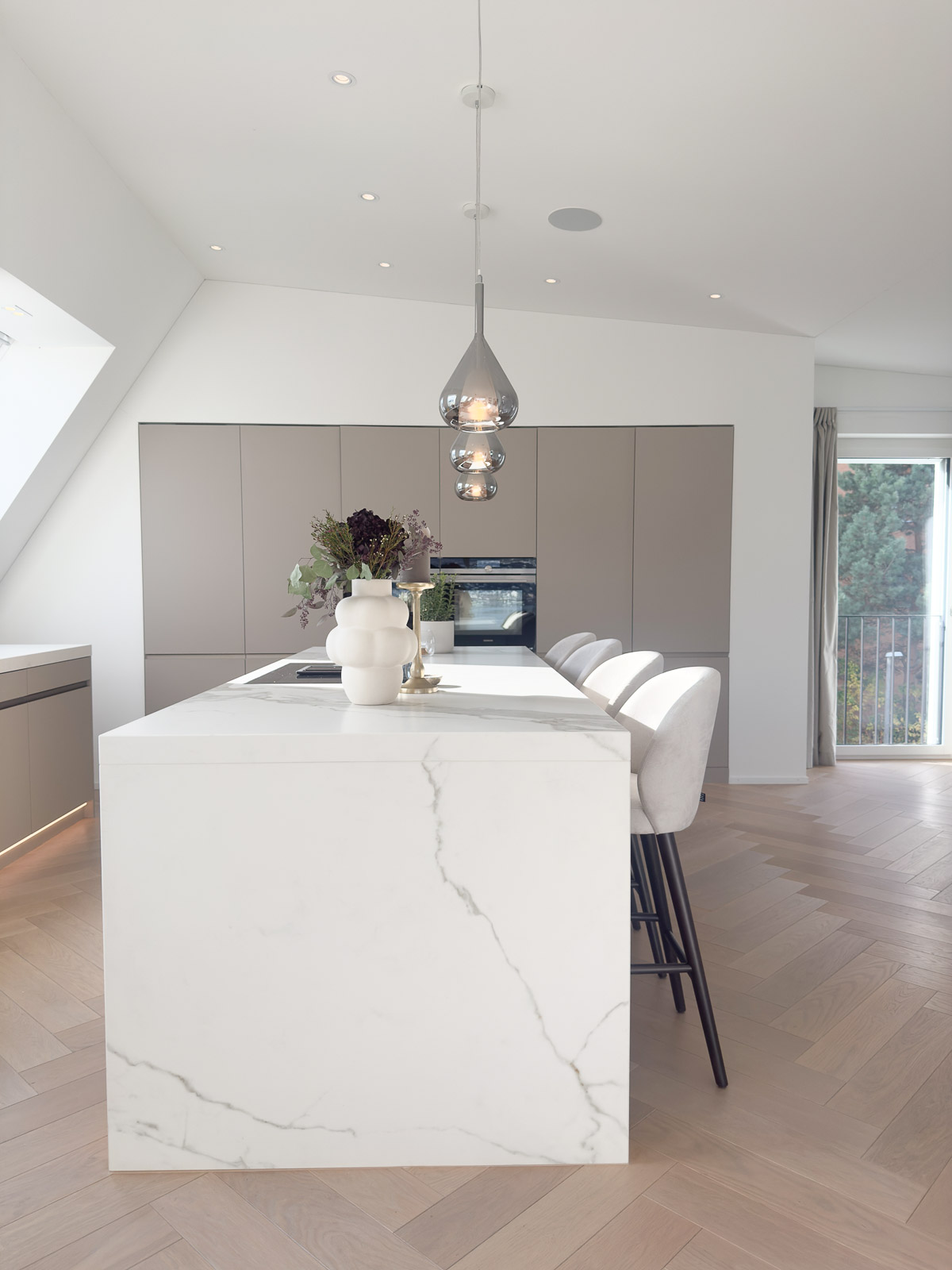Bei der Materialwahl lag der Schwerpunkt auf edlen, langlebigen und hochwertigen Oberflächen. Ein moderner Fischgrat-Parkettboden sorgt für Wärme und Eleganz, während Marmor-Optik-Steinplatten in Küche und Bad eine ruhige, luxuriöse Note setzen. Die grosszügigen Flächen wirken bewusst reduziert und unterstreichen den exklusiven Charakter des Penthouses.
